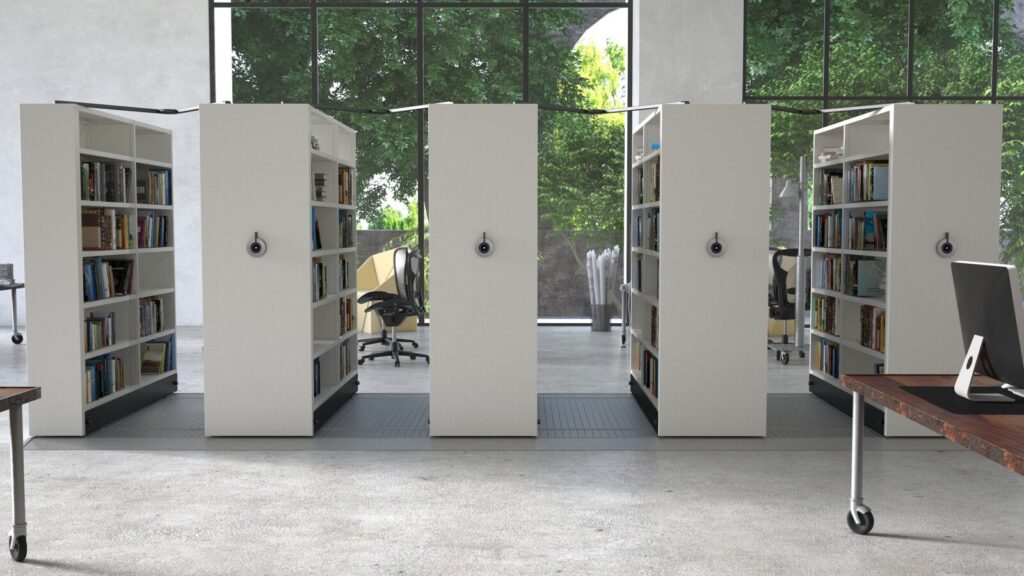 Your choice of the mobile shelving system provided by Kins will ensure that you increase the storage capacity by more than 80% or save more than 50% of the space to be used for other purposes, because the fixed shelves and mobile shelving systems need a large number of corridors that enable entry between units to take out the saved files, and these corridors take up spaces, which reduces the number of units and storage capacity of the place, all of this has been resolved in the mobile shelving system to save documents and files.